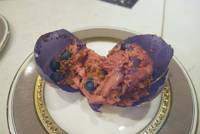 這顆北國之戀用紫色糖球包覆住紫羅蘭慕斯、新鮮藍莓和杏仁酥餅,旁邊另附一球泰莓雪酪。敲開糖球的愉悅感大概就和敲破焦糖烤布蕾上的脆糖差不多意思,唯獨糖球的技術性高了很多,他們家的糖球殼既薄又勻稱真是好功夫!味道上是很安定的風味,紫羅蘭的花香很溫和滑順,藍莓飽滿清甜,中間除了碎酥餅外還加入了跳跳糖,吃第一口是小驚喜,但是跳跳糖超多的吃到後面只覺得啊你是跳完了沒我根本沒辦法好好嚐味道!!!XD